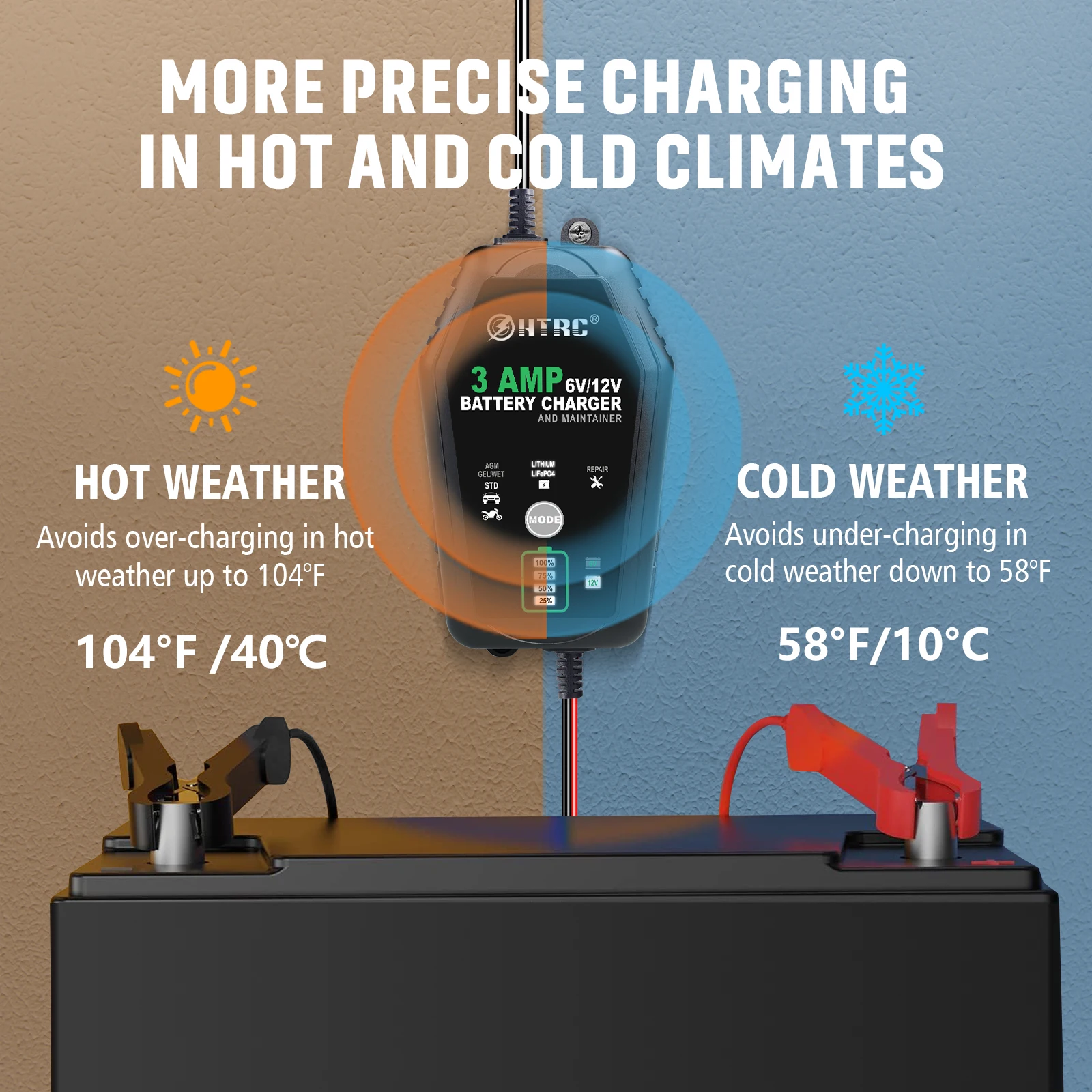 The advanced weather-adaptive technology ensures optimal charging in temperatures from 58°F to 104°F, automatically adjusting parameters to protect your battery in extreme conditions.
