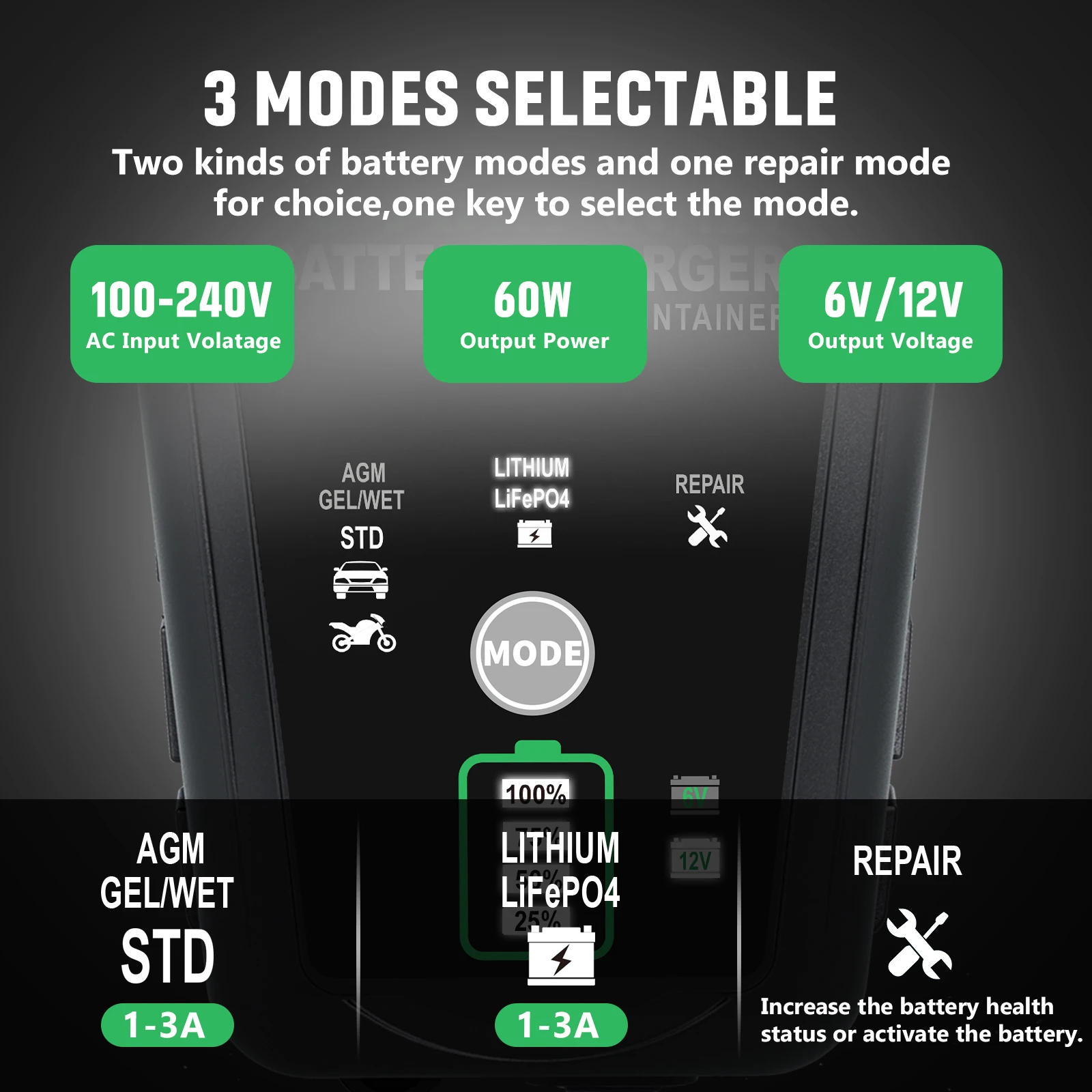 Three specialized charging modes (STD & AGM, Lithium, and Repair) provide targeted care for different battery types. The system automatically selects the optimal charging strategy based on battery condition.