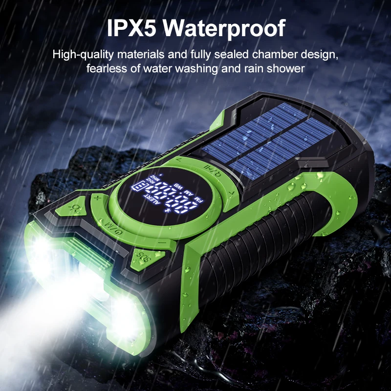 Feature: 1. FM/AM/NOAA: With FM and AM radio frequencies, you can stay updated on the latest news, music, and broadcasts. multi-powered all-band radio also features NOAA weather alerts, automatically notifying you of severe weather conditions in your area, ensuring you're prepared for any disaster.2. LCD Display: The intuitive LCD screen displays time, frequency, battery level, and alarms, providing clear indications to replace inefficient analog pointers. emergency weather radio is easy to use in low-light conditions, allowing you to find your desired station even in dim or uncertain situations. 3. 3 Lighting Modes: Equipped with a flashlight and reading light, weather alert radio offers three brightness levels (high beam, low beam, SOS flash). The high-quality LED lights provide a bright, focused beam for outdoor activities in flashlight mode, while the reading light mode offers softer and diffused light for indoor reading or work. 4. 4 Charging Methods: This AM/FM/NOAA weather radio can be charged through its built-in 5000mAh rechargeable battery, solar panel (when placed under sufficient sunlight), hand crank generator, or via USB external DC5V 1-2A power source. This means you can power the device anytime, anywhere, without worrying about running out of battery when you need it the most. 5. Large Capacity and Long Battery Life: The high-quality lithium polymer battery has a capacity of 5000mAh, supporting up to 30 hours of uninterrupted Bluetooth-Compatible5.3 speaker playback or radio listening. It can also charge your smartphone, tablet, or any USB-powered device multiple times. The all-in-one portable emergency radio can serve as a phone charger, enabling you to make important calls or send messages in emergency situations. Made with premium sealed materials, it is weather-resistant, making it perfect for outdoor adventures. In case of emergencies during outdoor explorations, pressing the SOS button on the side will emit a loud alarm and flashing red light to attract attention. This portable radio is ideal for home use and outdoor survival, such as during power outages, fishing trips, and hurricanes. Specification: Certification: CE Origin: Mainland China Function: Built-In Speaker,Flashlight Type: AM / FM,SW Style: Portable Power Supply: Rechargeable Battery Pack Screen: Yes Package: Yes Bluetooth-Compatible: Yes Body Material: Plastic Product name: Emergency disaster prevention radio Product color: red, orange, green (optional) Body material: plastic Frequency Range: AM: 520-1710KHz FM: 87-108MHz WB (NOAA) 162.400-162.550MHZ This function is only available in the United States. power supply: Rechargeable battery: polymer 3.7V 5000mAh Solar panel output: 5V 45mA Hand crank power generation output: 5V 300mA USB charging output: 5V 2A Charging 5V input: 5V 1.5A LED lights: High beam: 3W Low beam: 0.48W Radio output maximum power: 1.9W Headphone jack: 3.5mm Speaker: 3W Bluetooth-Compatible version: 5.3 Product size: 165.00x89.00x58.00mm/6.5x3.5x2.28inch Product weight: 320g